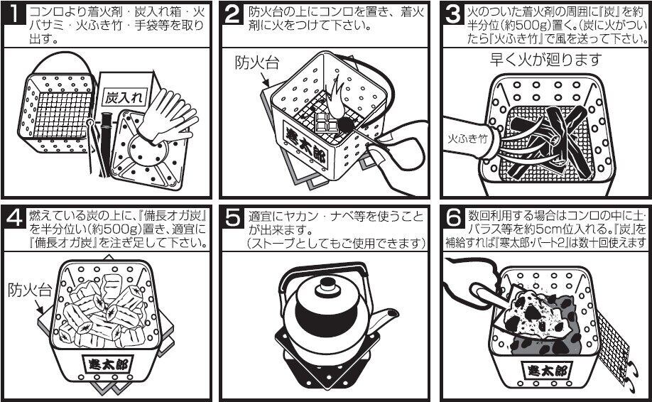 ※・燃料の「備長オガ炭」4kgを使い終わったら付近の木片・ダンボール紙等を燃やせば何回も使えます。